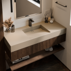 Dê um toque de luxo ao seu banheiro com a Bancada de Banheiro com Cuba Esculpida Retangular Prisma da Don Artesano. Fabricada em Superfície Sólida Mineral, é durável, resiste a manchas e é fácil de limpar. Suave ao toque e com acabamento impecável, ela transforma qualquer ambiente em um espaço exclusivo e refinado!